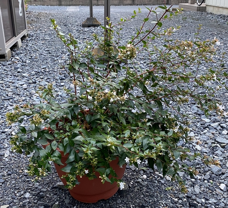 一昨年の梅雨時期に挿し木をして、3年目に突入したアベリア(ツクバネウツギ)。地上部の重みで傾いたまま成長したけど、引っ越しを機に強剪定することに。生垣らしくスタイリッシュに仕立て直せるのでしょうか?